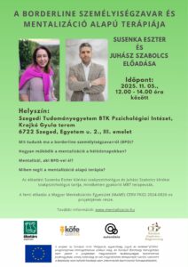 Egyéb kategória A borderline személyiségzavar és mentalizáció alapú terápiája előadás Elolvasom ➭ 2025.10.17.